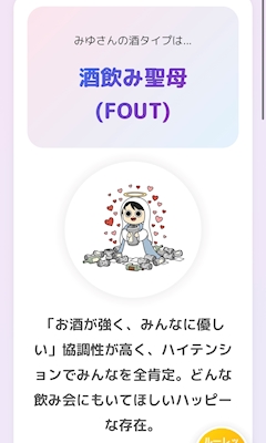 こんばんは!みゆです🖤 酒タイプ診断が流行ってるらしいのでやりました! 酒飲み聖母!😹 アル中番長が相性抜群らしいです🤜🏻🤛🏻 最近いろんなタイプ診断がどんどん出てきて楽しいです ! みなさんぜひやってみてください! みゆでした>ω<
